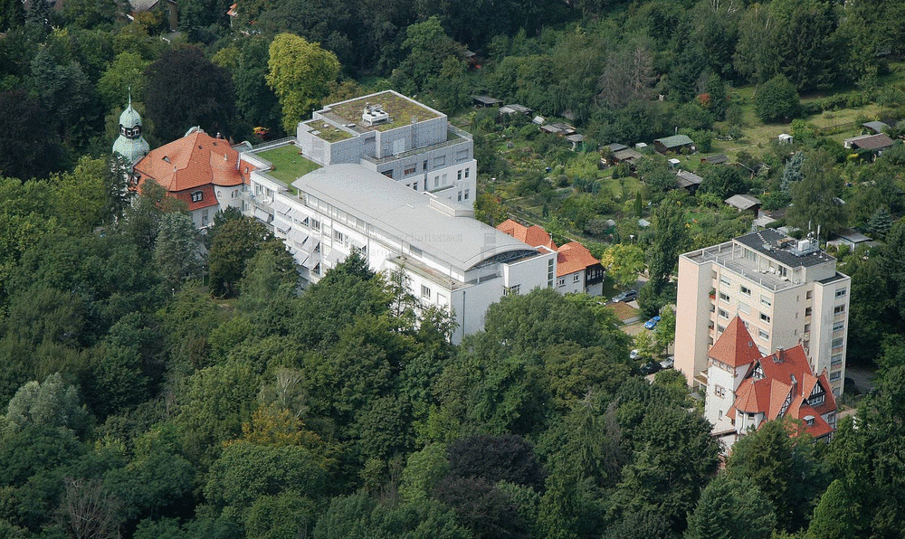 Der Altbau des Marienhospitals gehört zu den wenigen reinen Jugendstilhäusern DAs unterhalb der Mathildenhöhe. Das Gebäude entstand 1905/06 nach Plänen des Darmstädter Architekten Karl Klee (1871-1927). Auftraggeber war der Darmstädter Maschinenfabrikant Goebel (Maschinen- und Apparatebau). Er hatte sich von Klee eine imposante Villa planen lassen, in der er mit seiner Familie lebte. Weil das Anwesen am Martinspfad neben einem kleinen Forellenteich lag, nannte Goebel sein Haus „Haus am Forellenteich. Klee gab sich beim Entwurf des pompösen Wohnhauses viel Mühe mit den gestalterischen Details. Das Vordach am Haupteingang besteht aus einer filigranen Metallkonstruktion mit Glasfüllung. Eine Kristall-Leuchte vervollständigt das Entree, das mit fast jeder Metro-Station in Paris konkurrieren könnte. Gleich neben dem Eingang mit reich verzierter Tür erregen Kellerfenstergitter mit aufwändigem Blütendekor die Aufmerksamkeit der Besucher. In flotten Jugendstillettern hat sich Klee selbst als Planer im Stein verewigt, zusammen mit Hinweisen auf das Baualter des Hauses. Über der Holztür mit schmiedeeisernem Dekor prangt der Name der Villa „Haus am Forellenteich“. Der Turmstumpf unter der großen mit Grünspan patinierten Kuppel ist aus dunklem Holz geschnitzt. Züngelnde Drachen fernöstlicher Herkunft speien nach Regengüssen Wasser vom biberschwanzgedeckten Dach. Karl Klee gehörte zu den wenigen freischaffenden Darmstädter Architekten, die sich gelegentliche Ausflüge ins Jugendstildekor erlaubten. Parallel zu dieser Villa baute Klee 1905/06 ein weiteres Projekt mit imposantem Jugendstilschmuck: die Hofmöbelfabrik Alter in der Kirschenallee. Das gut erhaltene Fabrikgebäude beherbergte das Haus für Industriekultur als Außenstelle des Hessischen Landesmuseums, ist aber seit Ende 2023 wegen Baufälligkeit geschlossen.